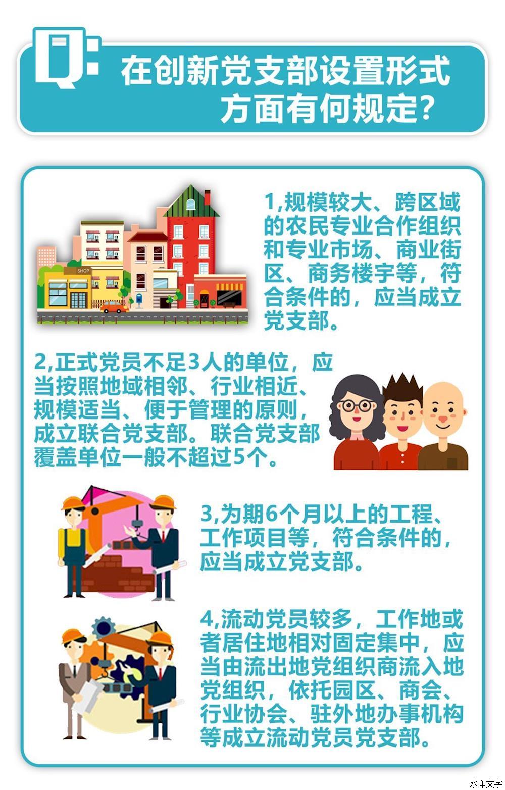 第四條 黨支部設(shè)置一般以單位、區(qū)域為主,以單獨組建為主要方式。企業(yè)、農(nóng)村、機關(guān)、學(xué)校、科研院所、社區(qū)、社會組織、人民解放軍和武警部隊連(中)隊以及其他基層單位,凡是有正式黨員3人以上的,都應(yīng)當成立黨支部。