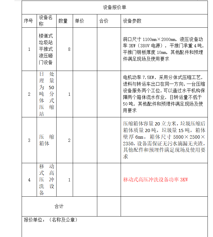 二、詢價(jià)內(nèi)容:1、樓道式垃圾站平推式液壓砸門設(shè)備及其配件8套;2、20立方米分體式壓縮站(包含一臺壓縮機(jī)構(gòu)、兩個箱體、一套水平移動機(jī)構(gòu)、移動式高壓清洗設(shè)備一套)及其配件1套(配套原有勾臂車使用)