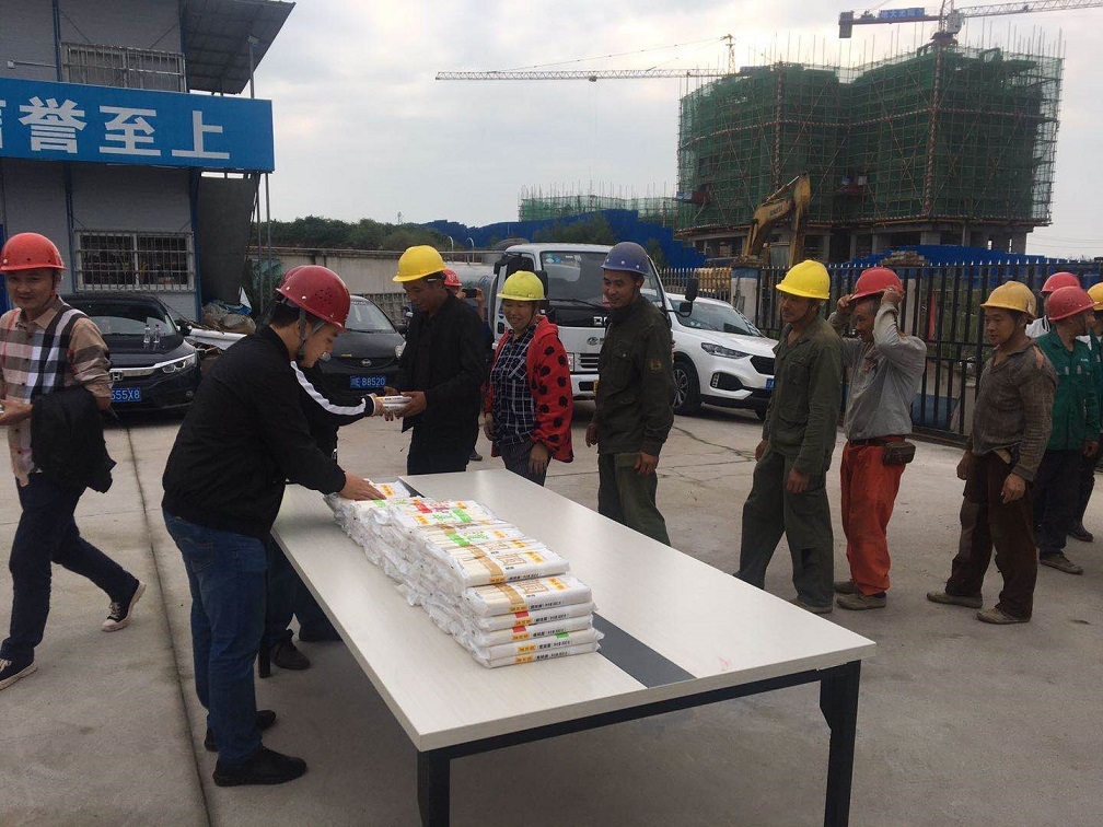 在中秋國慶雙節(jié)來臨之際,合江縣住房和城鄉(xiāng)建設(shè)局歐耀檣副局長帶領(lǐng)質(zhì)量安全監(jiān)督站人員到鑫晟學府項目為一線工人發(fā)放國慶面。歐耀檣副局長向常年奮戰(zhàn)在一線的建筑工人致以節(jié)日的問候,希望一線工人在工作中要時刻增強安全意識,既要把工作干好,更要注意自身安全,度過平安、快樂、祥和的中秋節(jié)、國慶節(jié)。